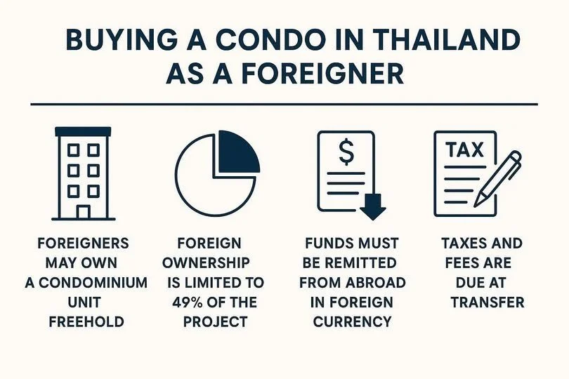 Thailand’s condominium framework is a practical advantage for international buyers: foreigners can purchase condominium units on a freehold basis, subject to the 49% foreign quota (measured by total saleable area).